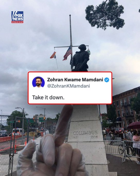 Zohran Mamdani gives his middle finger to a Christopher Columbus statue but he won’t tell you about his connection to slavery.. pic.twitter.com/lXcu92c6Nf